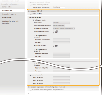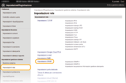 Il Protocollo Simple Network Management (SNMP) è un protocollo per il monitoraggio e il controllo dei dispositivi di comunicazione in una rete tramite Management Information Base (MIB). La macchina supporta SNMPv1 e SNMPv3 con sicurezza potenziata. È possibile verificare lo stato della macchina da un computer quando si stampano documenti o si utilizza la IU remota. È possibile abilitare SNMPv1 o SNMPv3 o entrambi contemporaneamente. Specificare le impostazioni per ogni versione, in modo da adeguarsi all'ambiente di rete e allo scopo di utilizzo.