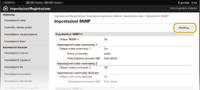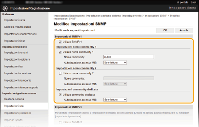 È inoltre possibile specificare le impostazioni SNMPv1 e abilitare/disabilitare le impostazioni SNMPv3 dal <Menu> nella schermata <Schermata principale>. Impostazioni SNMP