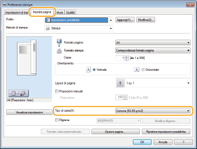 Impostazioni carta sulla macchinaNormalmente, è necessario specificare il formato e il tipo di carta caricata in ciascuna origine carta prima di procedere con la stampa. Indicazione di formato e tipo di carta