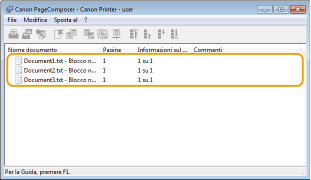 Con Canon PageComposer è possibile combinare più documenti in un lavoro di stampa e stampare il lavoro con le impostazioni di stampa specificate. Questa funzione, ad esempio, consente di combinare documenti creati con applicazioni diverse e stampare tutte le pagine nello stesso formato.