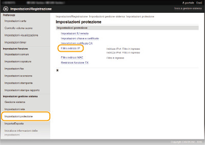 Se gli indirizzi IP sono immessi in modo non corretto, potrebbe non essere possibile accedere alla macchina dalla IU remota, in questo caso è necessario impostare <Filtro indirizzi IPv4> o <Filtro indirizzi IPv6> su <Off>. Filtro indirizzi IPv4 Filtro indirizzi IPv6
