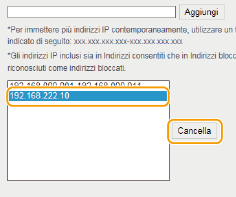 Eliminazione di un indirizzo IP dalle eccezioni Selezionare un indirizzo IP e fare clic su [Cancella].