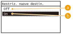 Quando questa funzione è abilitata, la macchina impedisce agli utenti l'immissione di destinazioni utilizzando i tasti numerici, l'aggiunta di nuovi dati alla Rubrica e la modifica dei dati esistenti nella Rubrica. |