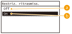 Impedisce di specificare destinazioni dai record di trasmissione. L'uso di questa restrizione impedisce la selezione di destinazioni dai record di trasmissione per "Invia fax", "Esegui scansione e invia via e-mail" e "Esegui scansione e salva in cartella condivisa".