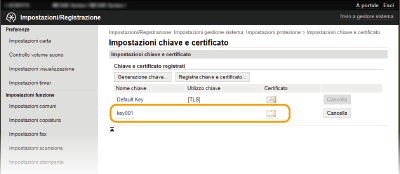 Una coppia di chiavi non può essere eliminata se viene attualmente utilizzata per un determinato scopo, ad esempio quando "[TLS]" o "[IEEE 802.1X]" sono visualizzati in [Utilizzo chiave]. In questo caso, disabilitare la funzione o sostituire la coppia di chiavi prima dell'eliminazione.