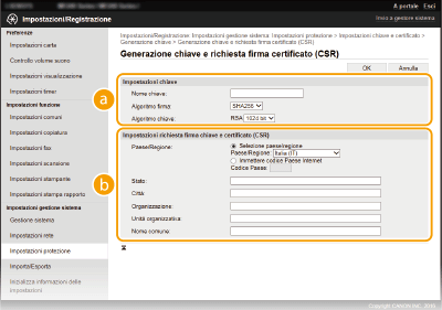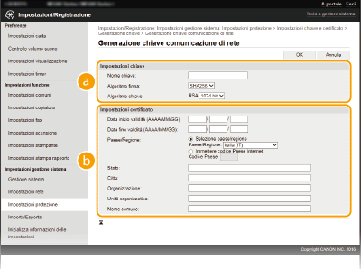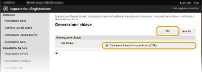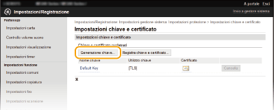Quando è richiesta per la comunicazione tramite Transport Layer Security (TLS), è possibile generare una coppia di chiavi con la macchina. È possibile utilizzare TLS quando si accede alla macchina tramite la IU remota. Possono essere generare fino a cinque coppie di chiavi nella macchina (comprese le coppie preinstallate). I certificati autofirmati sono utilizzati con le coppie di chiavi generate in "Comunicazione di rete". Tramite una "Chiave e richiesta firma certificato (CSR)", è possibile richiedere un certificato digitale emesso da CA per la coppia di chiave generate dalla macchina.