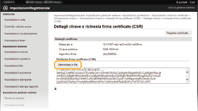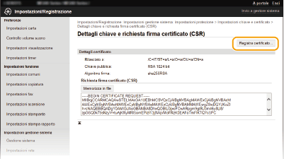 Non è possibile utilizzare la coppia di chiavi generate con la richiesta CSR (Certificate Signing Request) finché non viene registrato il certificato. Una volta che l'autorità di certificazione (CA) ha emesso il certificato digitale, provvedere a registrarlo attenendosi alla seguente procedura.