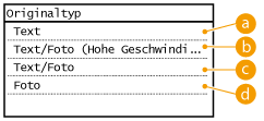 Sie können die optische Bildqualität für die Kopie abhängig vom Dokumententyp auswählen, wie zum Beispiel Nur-Text-Dokumente, Dokumente mit Diagrammen und Grafiken oder Zeitschriftenfotos.