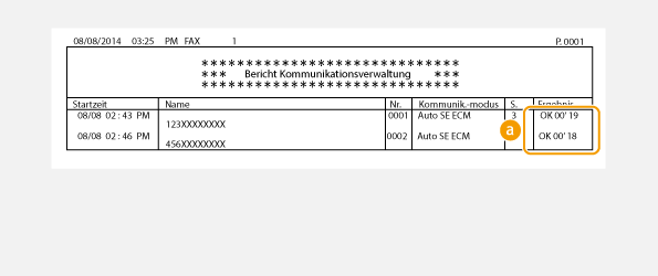 Wenn ein Fehlercode erscheint). Bei E-Mails gibt der Kommunikationsverwaltungsbericht Aufschluss über das Ergebnis der Übertragung zwischen dem Gerät und dem E-Mail-Server, nicht zwischen dem Gerät und dem Empfänger.
