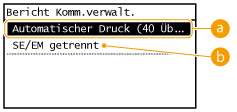 Tippen Sie auf <Ein>, wenn der Sende- und der Empfangsbericht getrennt gedruckt werden sollen, oder auf <Aus>, wenn beide Berichte auf einem Blatt gedruckt werden sollen.