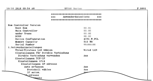 Liste der Menüeinstellungen) sowie die im Gerät gespeicherten Einstellungen in einer Anwenderdatenliste drucken. Die Liste enthält das im Gerät gespeicherte Papierformat und den darin gespeicherten Papiertyp sowie die Druckeinstellungen von <SE-Ergebnisbericht>, <Bericht Kommunikationsverwaltung> und <EM-Ergebnisbericht>.