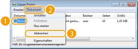 Abbrechen über Remote UISie können den Druckvorgang in Remote UI über die Seite [Auftragsstatus] abbrechen: Anzeigen des aktuellen Status von Druckdokumenten