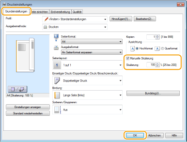 Die Vergrößerungs-/Verkleinerungseinstellungen mancher Anwendungen haben Priorität vor denen des Druckertreibers.