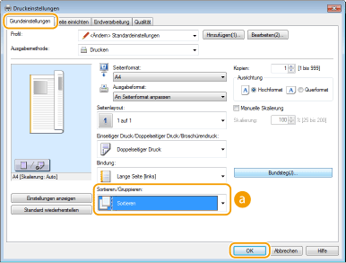 Wenn Sie [Aus] wählen, hängt es von der Einstellung in der Anwendung ab, ob die Ausdrucke sortiert werden.