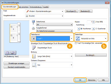 Wählen Sie in [Seitenlayout] die Anzahl der Seiten, die auf ein Blatt gedruckt werden sollen