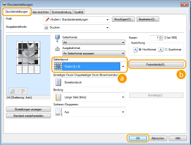 Sie können keine Einstellungen für die Postergröße auswählen, wenn die Funktion für den doppelseitigen Druck aktiviert ist. Wählen Sie [Einseitendruck] in [Einseitiger Druck/Doppelseitiger Druck/Broschürendruck], und wählen Sie dann eine Einstellung für die Postergröße.