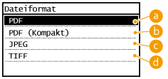 Sie können das Dateiformat auswählen, in dem die gescannten Dokumente gespeichert werden. Sie können zwischen PDF/JPEG/TIFF wählen. Bei PDF können Sie eine hochkomprimierte PDF-Datei mit einer geringeren Dateigröße wählen.