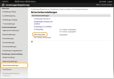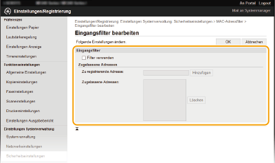 Sie können die Einstellungen für die MAC-Adressfilterung über <Menü> auf dem Bildschirm <Startseite> aktivieren oder deaktivieren. MAC-Adressfilter