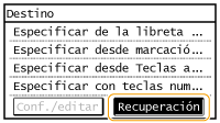 Si <Restringir reenvío desde registro> está establecido en <On>, no podrá utilizar esta función. Deshabilitación del uso de destinos utilizados anteriormente