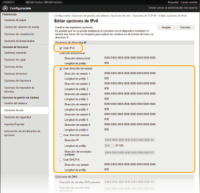 Las direcciones IPv6 del equipo pueden configurarse a través de la IU remota. Antes de configurar direcciones IPv6, compruebe las opciones de la dirección IPv4 (Visualización de las opciones de IPv4). Debe establecer las opciones de IPv4 correctas para poder utilizar direcciones IPv6. Tenga en cuenta que la función de escaneado que utiliza el controlador de escáner o MF Scan Utility no está disponible en los entornos IPv6. El equipo puede utilizar hasta nueve de las siguientes direcciones IPv6: