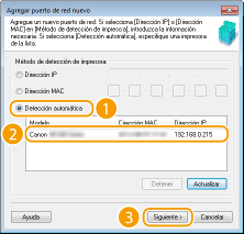 Haga clic en [Detección automática], seleccione el equipo cuando se detecte y haga clic en [Siguiente].