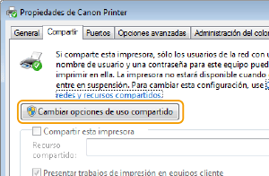 Haga clic en la pestaña [Compartir], seleccione [Compartir esta impresora] e introduzca el nombre compartido del equipo.