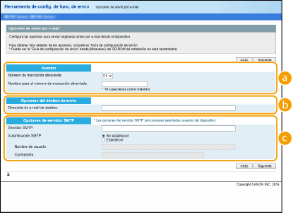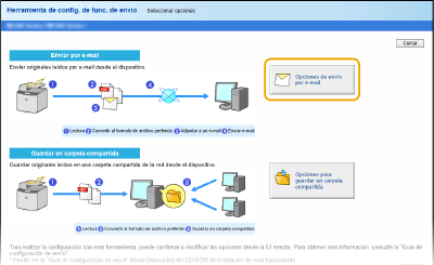 La Herramienta de configuración de la función de envío le ayuda a configurar las opciones básicas para el envío de e-mails. En lugar de la Herramienta de configuración de la función de envío, puede utilizar la IU remota para la configuración detallada de las opciones, como las opciones de autenticación POP antes de enviar o para la comunicación cifrada. Configuración de las opciones de comunicación de e-mail