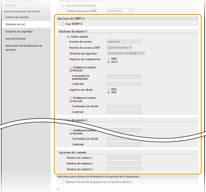 Si ambas versiones de SNMP están activadas, se recomienda establecer el permiso de acceso a MIB de SNMPv1 en [Sólo lectura]. El permiso de acceso a MIB puede establecerse de forma independiente en SNMPv1 y SNMPv3 (y para cada usuario en SNMPv3). Si se selecciona [Lectura/Escritura] (permiso de acceso completo) en SNMPv1 se invalidan las sólidas opciones de seguridad que caracterizan a SNMPv3, ya que la mayoría de las opciones del equipo pueden controlarse con SNMPv1.