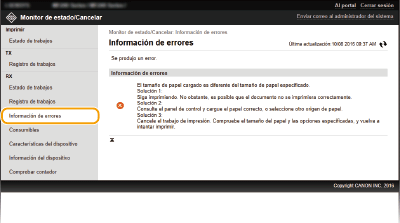 Cuando se produce un error, esta página aparecerá haciendo clic en el mensaje que aparece debajo de [Información de errores] en la página del portal (página principal).