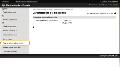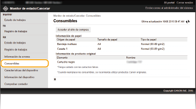 Se mostrará información sobre el tamaño y el tipo de papel para el origen del papel, el número de modelo del cartucho de tóner, etc. También podrá hacer clic en [Comprobar detalles de consumibles] en