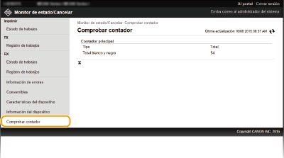 Se muestra la información sobre el equipo y el administrador del sistema. Esta información está establecida en [Gestión del sistema] en la página [Configuración].