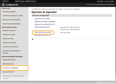Podrá activar o desactivar las opciones de filtrado de direcciones MAC desde <Menú> en la pantalla <Inicio>. Filtro de direcciones MAC