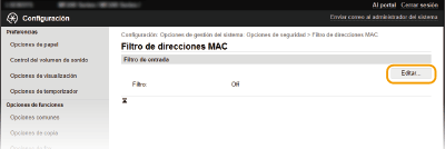 ![]() Comprobación de los errores de entrada Si las direcciones MAC se introducen de forma incorrecta, es posible que no pueda acceder al equipo desde la IU remota, en cuyo caso deberá establecer <Filtro de direcciones MAC> en <Off>. Filtro de direcciones MAC