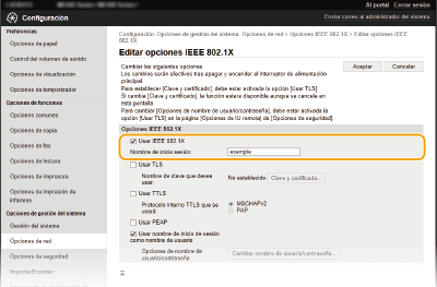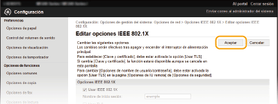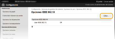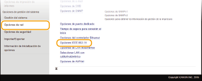 Uso del panel de controlTambién podrá activar o desactivar la autenticación IEEE 802.1X desde <Menú> en la pantalla <Inicio>. Opciones IEEE 802.1X