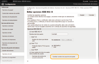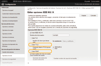 Seleccione la casilla de verificación [Usar TTLS] o [Usar PEAP].