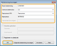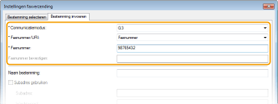 Stel de communicatiestand in en het faxnummer (of URI), en klik op [OK].