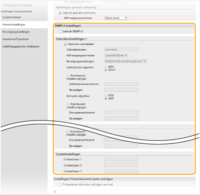 Schakel dit selectievakje in als u SNMPv3 wilt gebruiken. De overige instellingen voor SNMPv3 kunt u alleen opgeven als dit selectievakje is ingeschakeld.