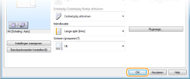 Klikbare UIOp de voorbeeldafbeelding kunt u gemakkelijk, op intuïtieve wijze, instellingen zoals de paginalay-out en inbindpositie opgeven. Klik voor meer informatie op [Help] op het scherm van het printerstuurprogramma.