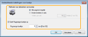 Als u een nietmachine of een ander inbindgereedschap gebruikt, geeft u de breedte van de rugmarge op voor het inbinden van het boekje. Selecteer het selectievakje [Geef Rugmarge boekje op] en geef de margebreedte op bij [Rugmarge boekje].