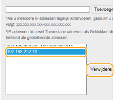 Een IP-adres verwijderen uit de uitzonderingen Selecteer een IP-adres en klik op [Verwijderen].