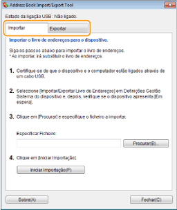 Pode exportar dados do livro de endereços guardados na máquina para um computador utilizando a Address Book Import/Export Tool (Ferramenta de importação/exportação do livro de endereços) incluída no DVD-ROM fornecido. É possível voltar a importar os dados, podendo ficar com uma cópia de segurança em caso de eliminação dos dados do livro de endereços devido a reparações ou manutenção.