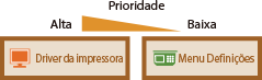 Prioridade de definiçõesSe uma definição de impressão for especificada no controlador da impressora e no painel de controlo da máquina, a especificação do controlador da impressora sobrepõe-se à especificação do painel de controlo. A especificação do painel de controlo torna-se efetiva nalguns casos específicos, como ao imprimir através de PCL e ao imprimir a partir de UNIX ou outro sistema operativo que não seja compatível com controladores de impressora.