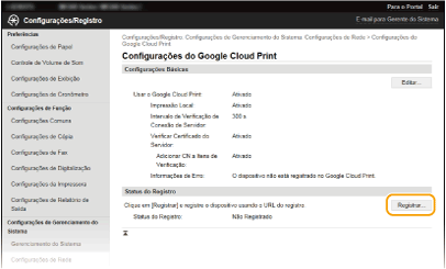 É necessário ativar o Google Cloud Print. Clique em [Editar], selecione a caixa de verificação [Usar o Google Cloud Print] e clique em [OK].