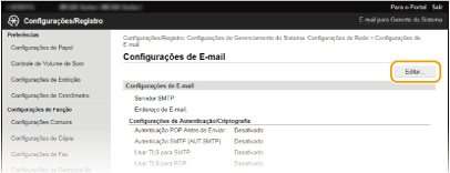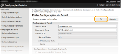 Antes de enviar correio eletrónico, utilize a UI Remota para configurar as definições detalhadas de envio, tais como as definições de autenticação POP e codificação da comunicação. Para obter as definições necessárias, contacte o seu fornecedor ou o administrador da rede.