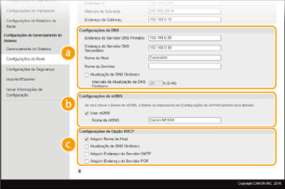 Adotado pelo serviço Bonjour, o mDNS (multicast DNS) é um protocolo utilizado para associar um nome de anfitrião a um endereço IP sem utilizar DNS. Selecione a caixa de verificação para ativar o mDNS e introduza o nome de mDNS na caixa de texto [Nome de mDNS]. [Configurações de Opção DHCP][Adquirir Nome de Host]