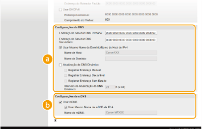 Selecione a caixa de verificação para atualizar os registos DNS dinamicamente sempre que o endereço IP da máquina for alterado. Para especificar o(s) tipo(s) de endereços que pretende registar no servidor DNS, selecione a caixa de verificação de [Registrar Endereço Manual], [Registrar Endereço Declarável] ou [Registrar Endereço Sem Estado]. Para especificar o intervalo entre atualizações, introduza o tempo em horas na caixa de texto [Intervalo de Atualização de DNS Dinâmico]. [Configurações de mDNS][Usar mDNS]