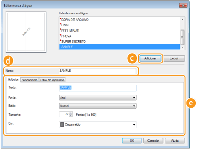 Clique em cada separador para especificar o texto, a cor ou a posição de impressão da marca de água. Para obter mais informações, clique em [Ajuda] no ecrã do controlador de impressora.