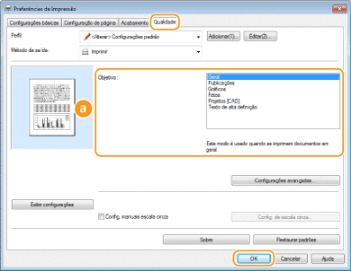 Para especificar definições detalhadas para cada item selecionado em [Objetivo], clique em [Configurações avançadas]. Para obter mais informações, clique em [Ajuda] no ecrã do controlador de impressora.
