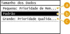 Pode especificar o rácio de compressão dos ficheiros ao converter documentos digitalizados em formato JPEG. <Pequena: Prioridade de Memória> torna o rácio de compressão mais elevado do que o normal para criar ficheiros mais pequenos com uma qualidade de imagem inferior. Por outro lado, <Grande: Prioridade Qualidade da Imagem> torna o rácio de compressão mais baixo do que o normal para criar ficheiros maiores com uma qualidade de imagem superior.