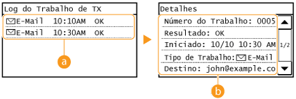 ![]() <Log do Trabalho de TX>Apresenta uma lista dos documentos que foram enviados. <OK> aparece quando um documento é enviado com êxito e <Erro> aparece quando um documento não é enviado por ter sido cancelado ou devido a um erro.
